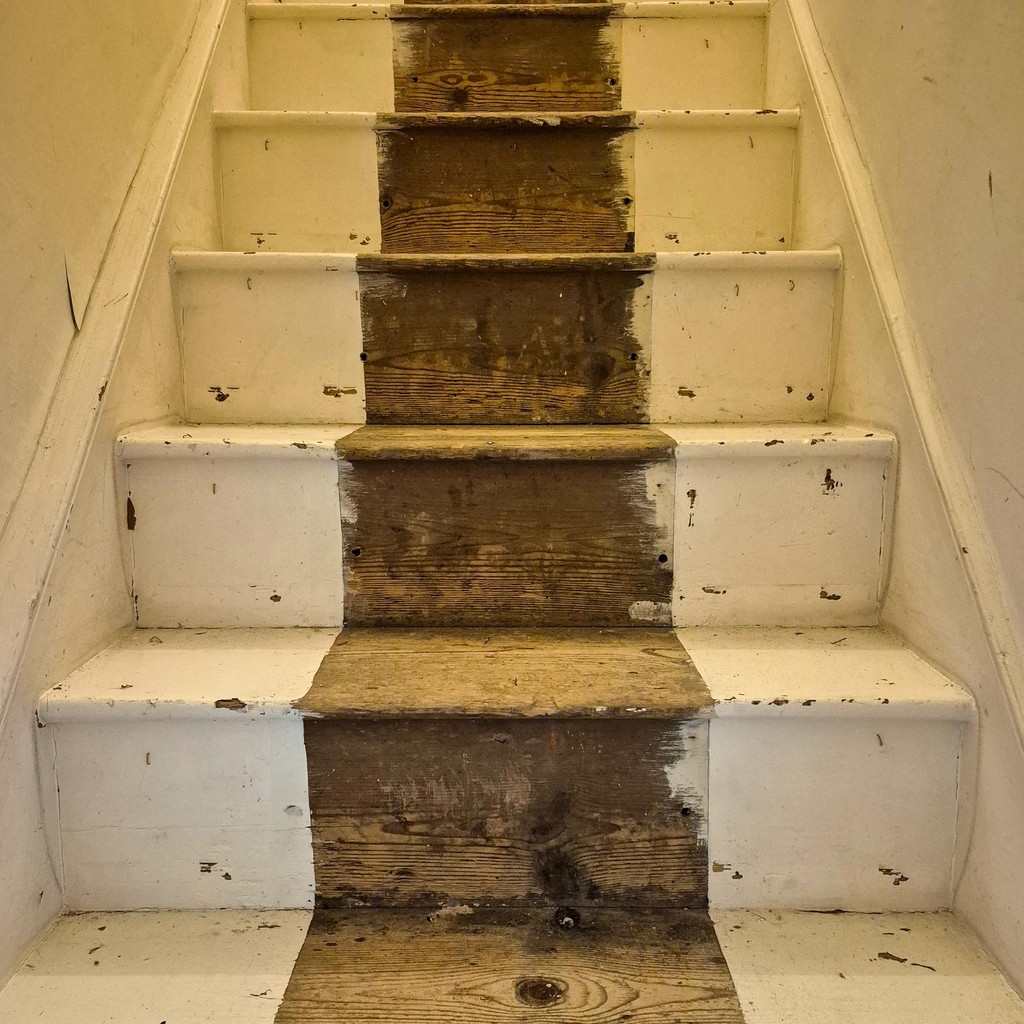 One of two attic rooms on the 2nd floor at S42. Infrequently used as photo back drops for new merchandise. The stairs are very steep and narrow and remind me very much of the stairs at my great grandparents house when I was a child. I can feel some sort of collage/decoupage project coming on with these stairs.